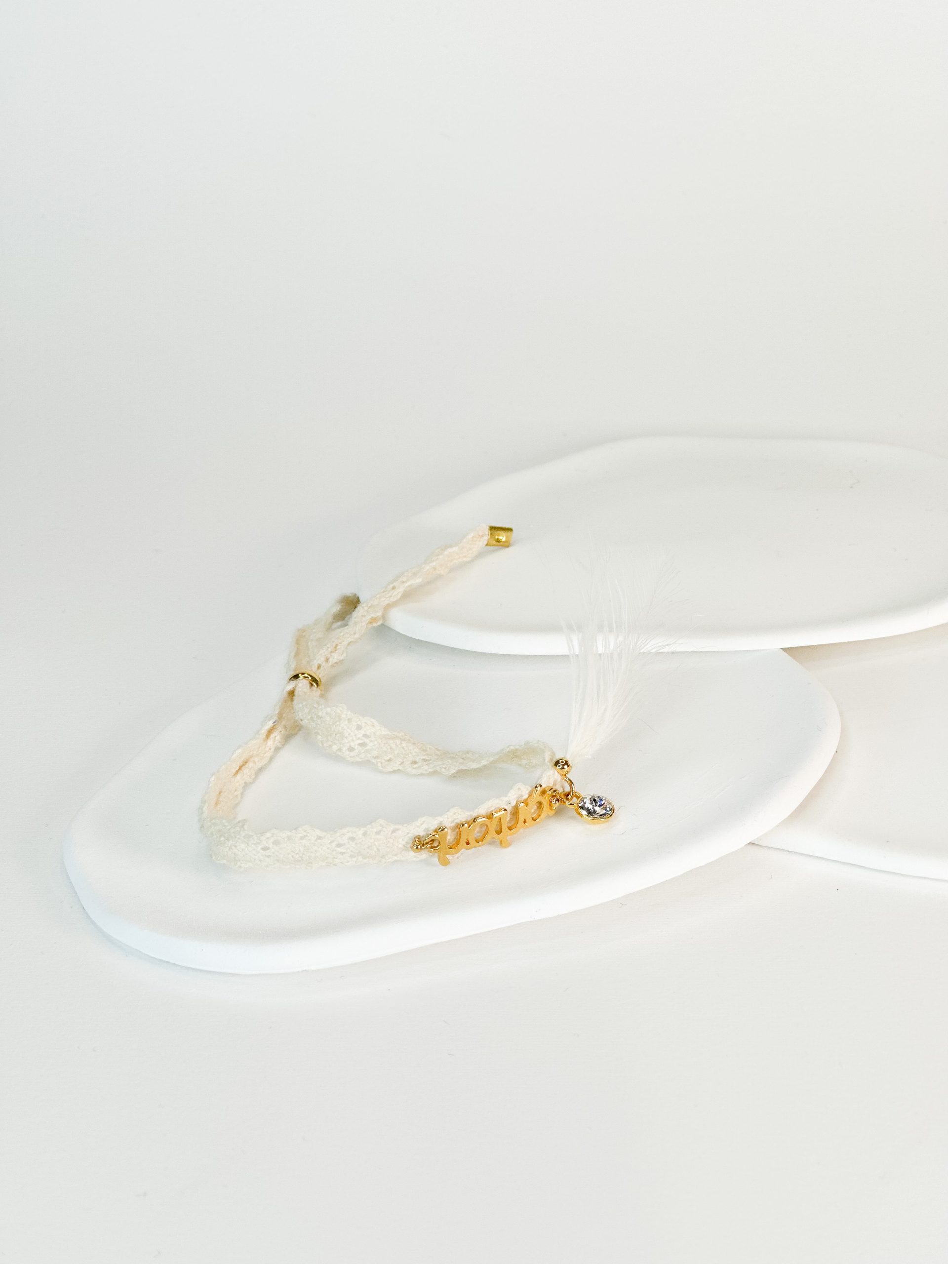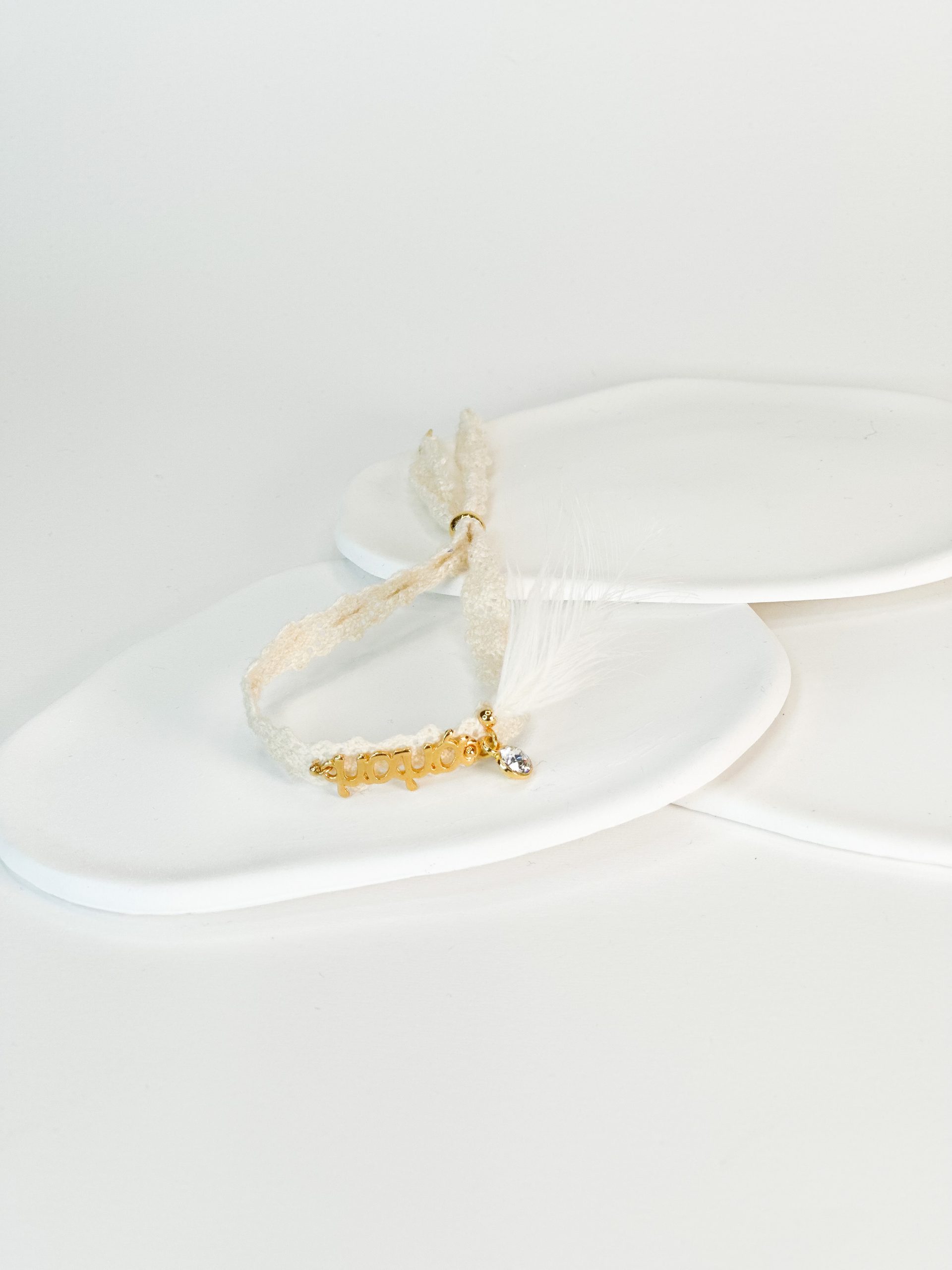 Βραχιολάκι με δαντέλα για την μαμά, την νονά και την γιαγιά μαζί με φτερό και σβαρόφσκι. Οι φωτογραφίες έχουν υποστεί επεξεργασία, ίσως να διαφέρουν λίγο τα χρώματα στην πραγματικότητα.