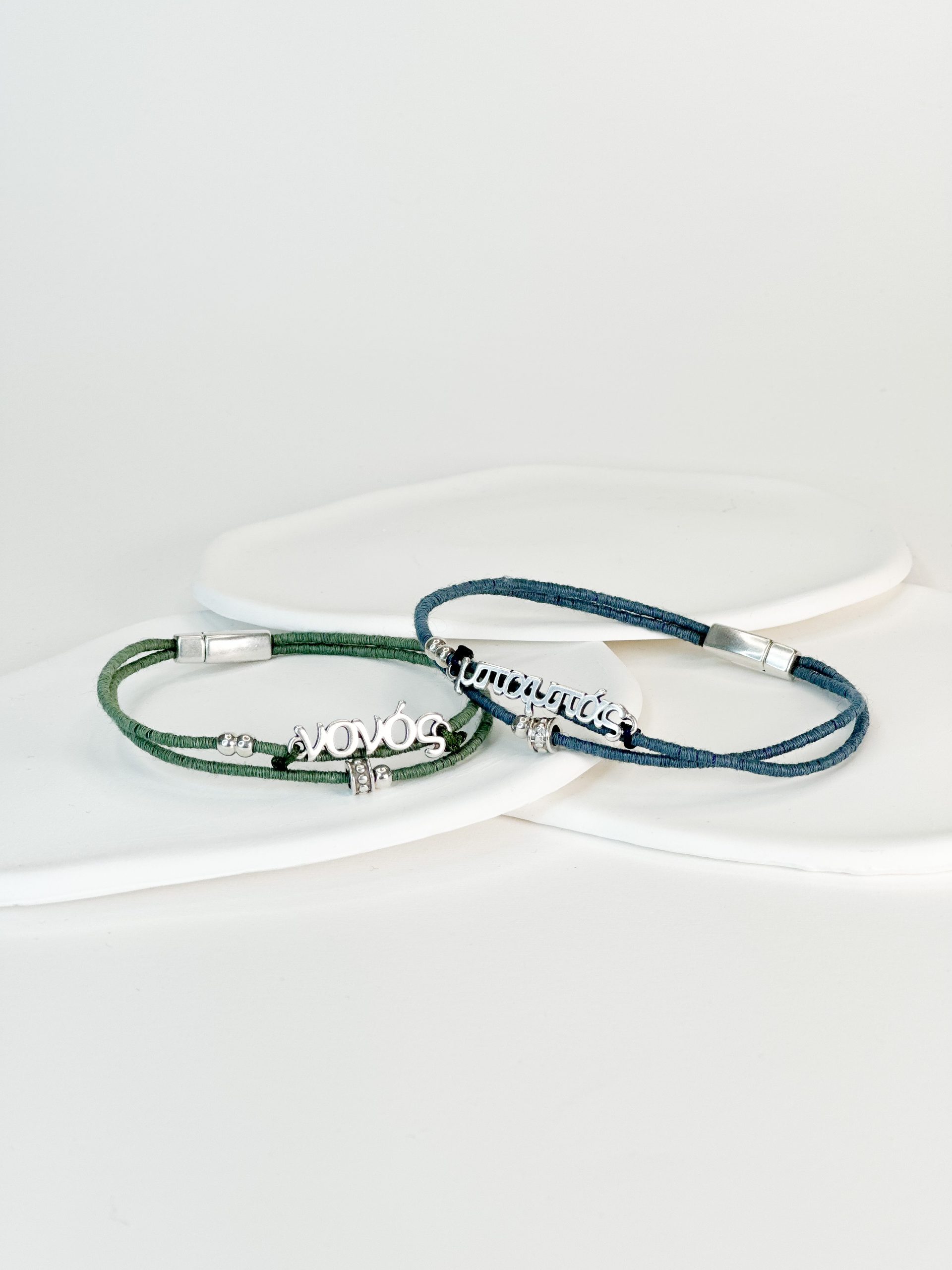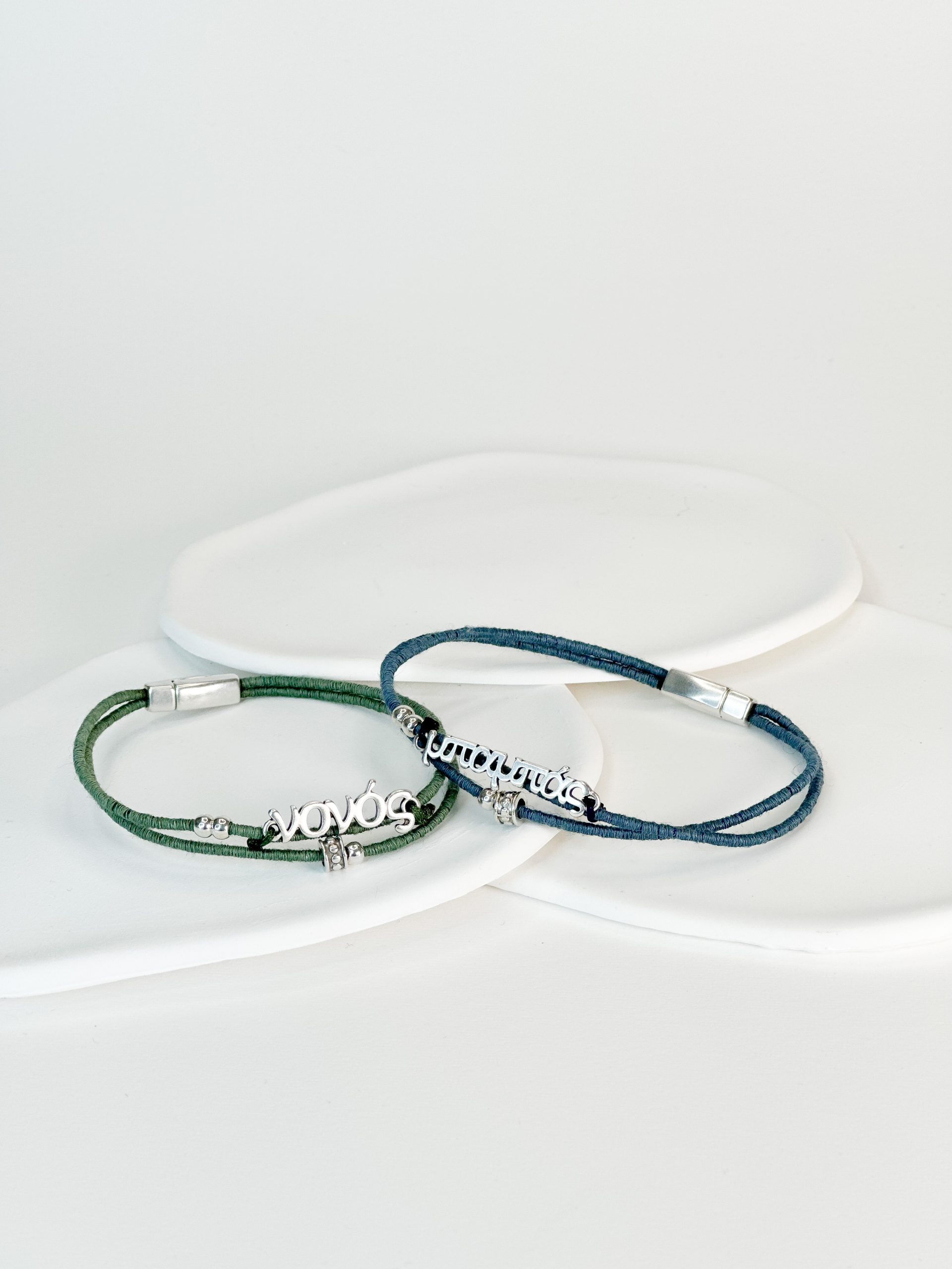 Βραχιολάκι για τον μπαμπά και τον νονό σε λαδί και μπλέ απόχρωση. Οι φωτογραφίες έχουν υποστεί επεξεργασία, ίσως να διαφέρουν λίγο τα χρώματα στην πραγματικότητα.