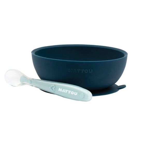 Σετ φαγητού αποτελούμενο από μπολ με βεντούζα και κουτάλι πρώτης ηλικίας, σε όμορφο χρωματικό συνδυασμό.