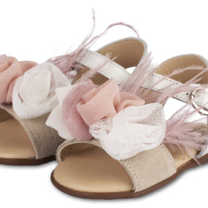 Δερμάτινο Πέδιλο Διακοσμημένο με Λουλούδια και Φτερά σε Εκρού Ροζ Χρώμα