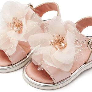 Δερμάτινο Πέδιλο με Χειροποίητο Λουλούδι απο Τούλι σε Ροζ Χρώμα