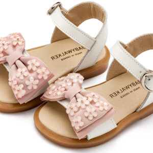 Δερμάτινο Πέδιλο με Gros Grain Φιογκάκι και Λουλουδάκια σε Εκρού Ροζ