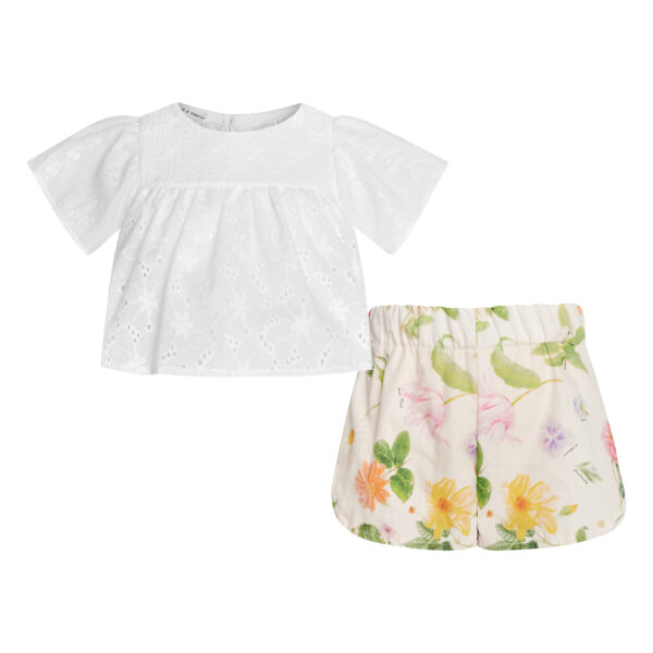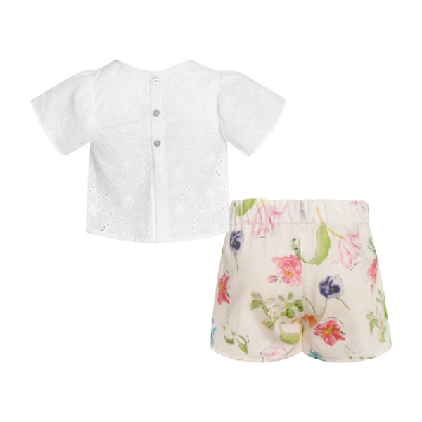 Σετ 100% βαμβακερό που αποτελείται από κοντομάνικη λευκή κιπούρ μπλούζα με κλείσιμο κουμπιά στο πίσω μέρος και φλοράλ σορτσάκι από ποπλίνα με λάστιχο στη μέση.