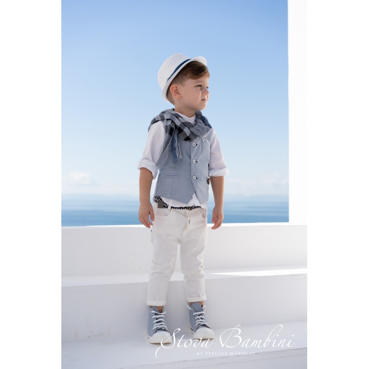 Η νέα πρόταση σε απόχρωση λευκού. Σετ 7 τεμαχίων με μοναδικό χρώμα στο σιέλ γιλέκο, λευκό μάο πουκάμισο και λευκό παντελόνι με διακοσμητικές σιέλ λεπτομέρειες στη ζώνη και στην διακοσμητική pochette. Στο σετ περιλαμβάνονται ζώνη, φουλάρι, ψάθινο καπέλο και ασορτί διακοσμητική pochette. Όλα τα υφάσματα είναι από υποαλλαεργικό βαμβάκι 100% ή σύμμικτα υποαλλεργικά υφάσματα.