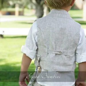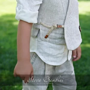 Bohemian SS25 Β17 by Stova Bambini Μια νέα πρόταση σε λινό κοστούμι βάπτισης σε απόχρωση άμμου, ένα από τα best seller του 2024, που το χαρακτηρίζει το ανάλαφρο πατρόν. Το παντελόνι έχει λάστιχο και κορδόνι σύσφιξης στην μέση για εύκολη και άνετη εφαρμογή. Το γιλέκο αποτελείται από βέλγικο λινό άριστης ποιότητας και δένει στο πλάι με μοντέρνο αξεσουάρ δεσίματος και υπέροχο διακοσμητικό αξεσουάρ στο πίσω μέρος του γιλέκου.