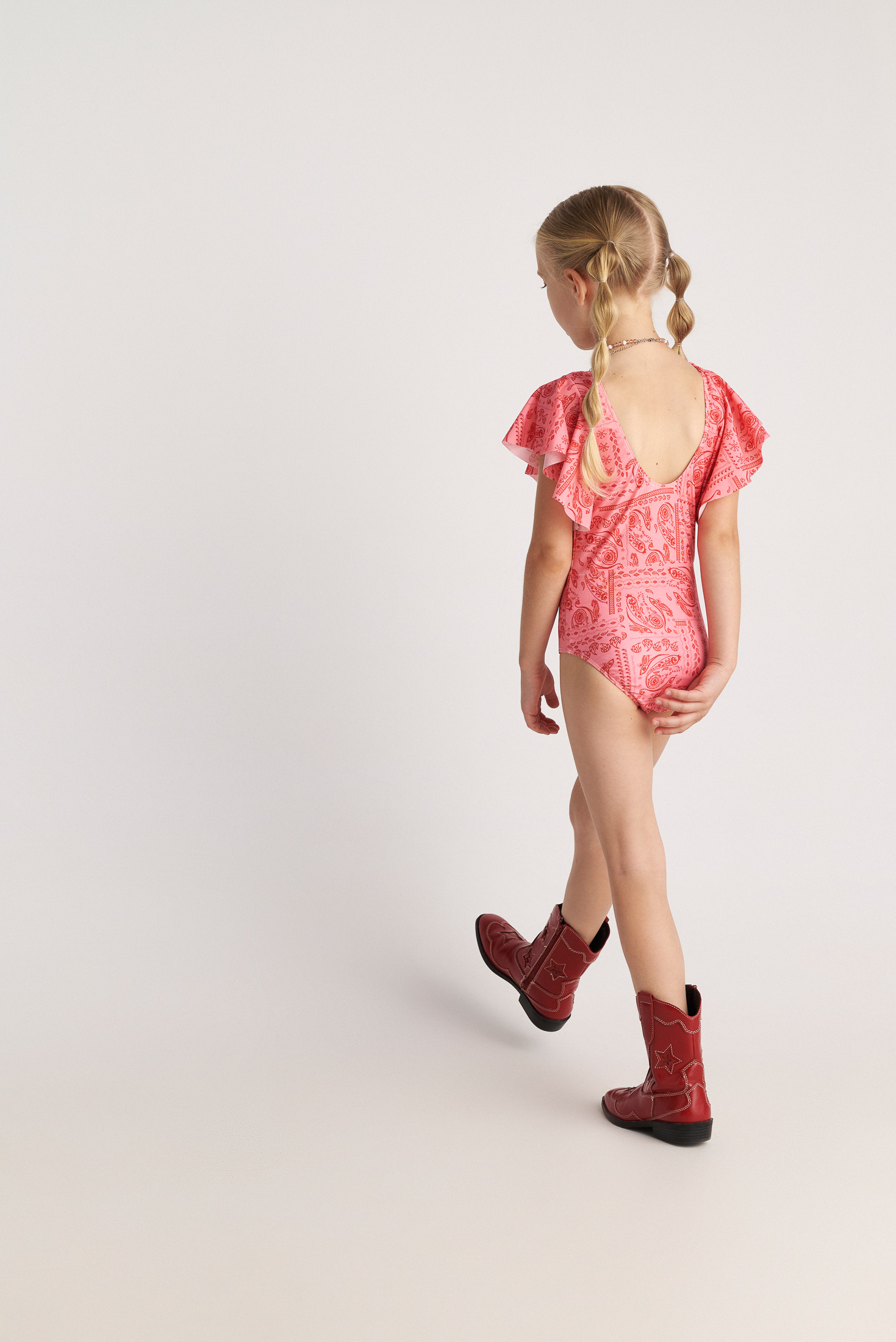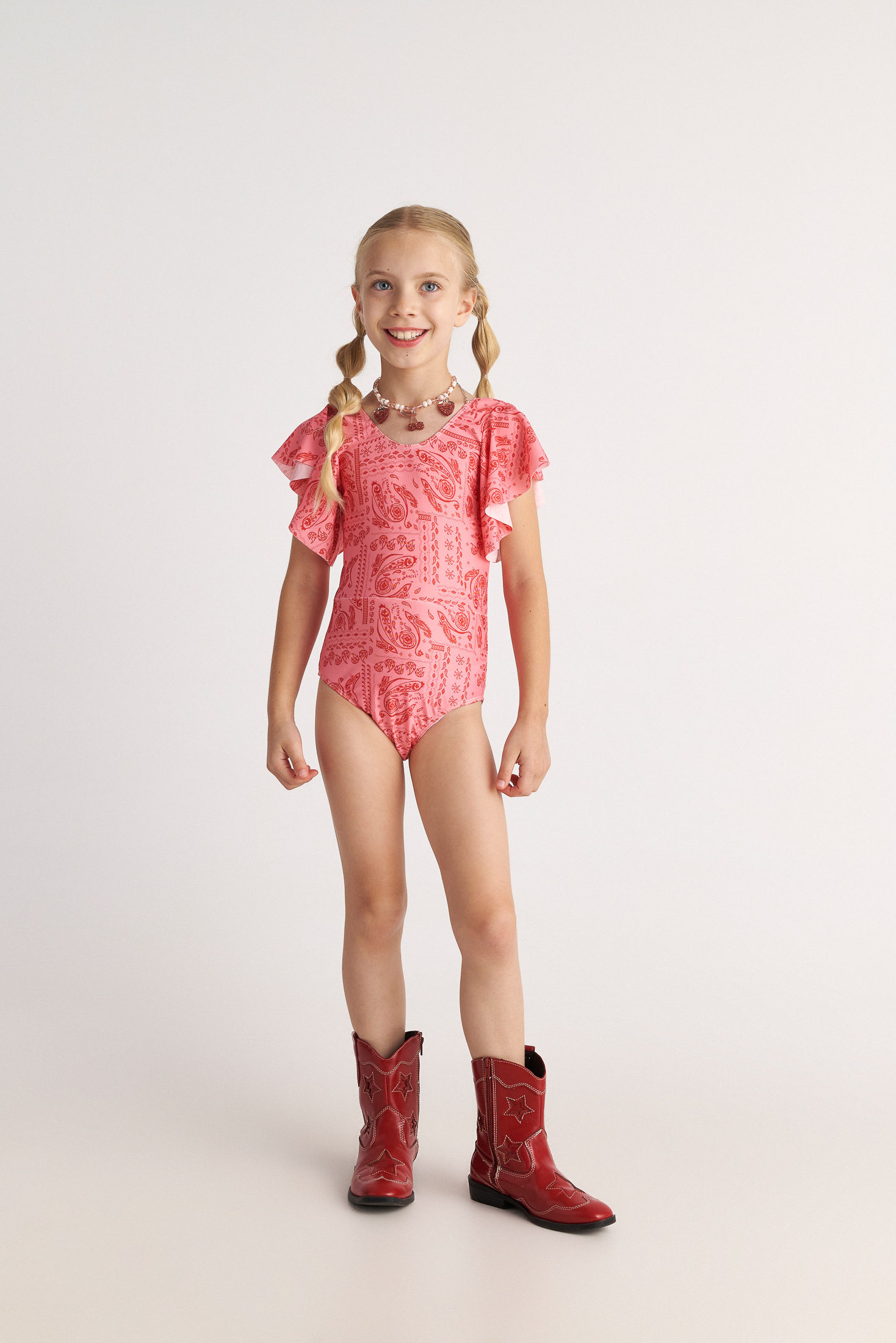 Ολόσωμο παιδικό μαγιό ροζ με λαχούρια.