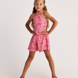 Αποτελείται από τοπ με μαντήλι (scarf top) και σορτς, με παιχνιδιάρικο μοτίβο τύπου bandana. Το απαλό ύφασμα προσφέρει άνετη εφαρμογή, ενώ ο σχεδιασμός του σετ χαρίζει φρέσκο, καλοκαιρινό look στα κορίτσια.