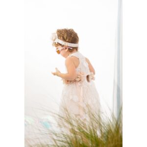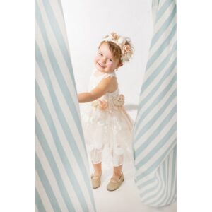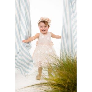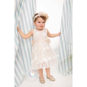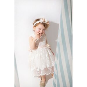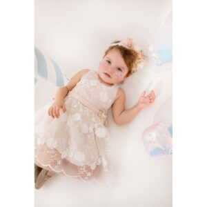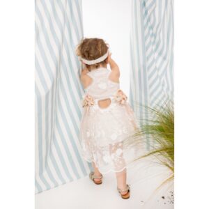 Nude φόρεμα με δαντέλα και χειροποίητα λουλούδια σε nude και πούδρα χρώμα. Ασύμμετρο φόρεμα με ιδιαίτερη πλάτη.