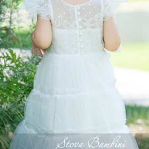 Ένα υπέροχο boho φόρεμα με κερωμένη δαντέλα στο κορσάζ και στο μανίκι, καθώς το φόρεμα κατασκευάζεται με μια καταπληκτική τεχνική υψηλής ραπτικής χειροποίητου ντραπέ σε όλο το υπόλοιπο φόρεμα και διακοσμείται με γαλλική δαντέλα σε ολόκληρη την φούστα. Εσωτερικά υπάρχει βαμβακερή, υποαλλεργική φόδρα και υποαλλεργικό βαμβακερό τούλι. Περιλαμβάνει ασορτί κορδέλα μαλλιών. Συνδυάζεται τέλεια με πέδιλα ή μπαλαρίνες Stova Bambini.