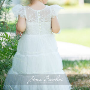 Ένα υπέροχο boho φόρεμα με κερωμένη δαντέλα στο κορσάζ και στο μανίκι, καθώς το φόρεμα κατασκευάζεται με μια καταπληκτική τεχνική υψηλής ραπτικής χειροποίητου ντραπέ σε όλο το υπόλοιπο φόρεμα και διακοσμείται με γαλλική δαντέλα σε ολόκληρη την φούστα. Εσωτερικά υπάρχει βαμβακερή, υποαλλεργική φόδρα και υποαλλεργικό βαμβακερό τούλι. Περιλαμβάνει ασορτί κορδέλα μαλλιών και συνδυάζεται τέλεια με πέδιλο ή μπαλαρίνες Stova Bambini.