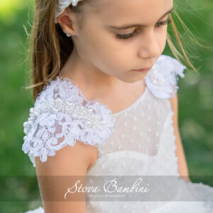Το πιο εντυπωσιακό φόρεμα της συλλογής ασύμμετρο με δυο layers στη φούστα, βάση από φίνο γαλλικό πουά τούλι με κέντημα. Το κορσάζ διακοσμείται από κοδονέ δαντέλα στο μανίκι και wave χειροποίητο κέντημα στη φούστα του επώνυμου γαλλικού οίκου Sophie Hallete. Η δαντέλα στερεώνεται με χειροποίητη τρέσα με πέρλες στο μανίκι και αντίστοιχο λεπτεπίλεπτο ζωνάκι στη μέση. Το φόρεμα έχει μια πανέμορφή πλάτη που σχηματίζεται ένα ανοιχτό V. Εσωτερικά διαθέτει βαμβακερή 100% υποαλλεργική επένδυση. Το σετ περιλαμβάνει ασορτί κορδέλα μαλλιών με πέρλες και συνδυάζεται τέλεια με χειροποίητες ανατομικές μπαλαρίνες Stova Bambini. Οι δαντέλες Sophie Hallete από το 1887 γράφουν ντύνοντας ιστορικές προσωπικότητες όπως την Marilyn Monroe, Jackie Kennedy, καθώς κοσμούν και τα νυφικά των βασιλικών γάμων της Μεγάλης Βρετανίας.