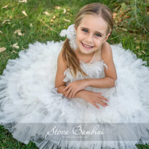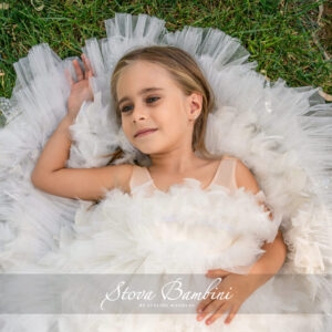Το πιο πολυσυζητημένο βαπτιστικό φόρεμα της Stova Bambini με διαφάνεια στο κορσάζ που δίνει την αίσθηση του στράπλες φορέματος αλλά είναι ντυμένο με οργανικό, βαμβακερό ημιδιάφανο τούλι και κούμπωμα στην πλάτη που το κρατάει σταθερό στο σώμα του παιδιού. Όλο το φόρεμα είναι διακοσμημένο από βολάν γαλλικό τούλι και κεντημένα πούπουλα δυο ποικιλιών. Περιλαμβάνει διακοσμητικό σταθερό ζβνάκι με πέρλες και υπέροχη κορδέλα μαλλιών. Εσωτερικά υπάρχει βαμβακερή, υποαλλεργική φόδρα και υποαλλεργικό βαμβακερό τούλι. Το συγκεκριμένο σχέδιο υψηλής ραπτικής  σετ διακοσμούν από χειροποίητη κεντημένη δαντέλα που σχηματίζουν μικρό φουρό και δίνουν μια αίσθηση sparkling εκκεντρικό και ταυτόχρονα νεραιδένιο. Συνδυάζεται τέλεια με τέλειες μπαλαρίνες με φιόγκο μπρος και πίσω εναλλάξ αποκλειστικό σχέδιο της Stova.