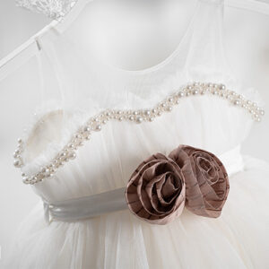 Φόρεμα μεσάτο τούλινο με διαφάνεια στο πάνω μέρος, κεντημένο περιμετρικά με πέρλες. Η φούστα του φορέματος στολίζεται με λεπτομέρειες δαντέλας. Το ντεκόρ του αποτελείται από σατέν λεπτό ζωνάκι με χειροποίητα μεταξωτά ριγέ λουλούδια σε σκούρα απόχρωση σάπιου μήλου. Συνοδεύεται από κλειστή ελαστική κορδέλα για τα μαλλιά με το ντεκόρ του φορέματος. Σετ 2 τεμαχίων. Η τιμή ισχύει για τα μεγέθη έως 24 μηνών. Διαθεσιμότητα έως εξαντλήσεως των αποθεμάτων.