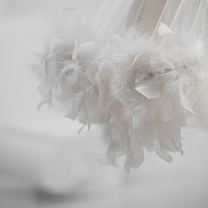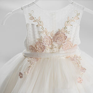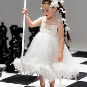 Φόρεμα μεσάτο με πουά διαφάνεια στο μπούστο. Διακοσμείται στο πάνω μέρος από απλικαρισμένη δαντέλα κεντημένη με χρυσοκλωστή σε απαλές αποχρώσεις του ροζ και του σομόν. Η εντυπωσιακή φούστα του φορέματος είναι στολισμένη στο τελείωμα με ιβουάρ πούπουλα. Το φόρεμα έχει πουά τούλινη ζώνη και δένει στο πίσω μέρος με φιόγκο. Συνοδεύεται από κλειστή ελαστική κορδέλα για τα μαλλιά με λεπτομέρειες δαντέλας και πούπουλα. Σετ 2 τεμαχίων. Η τιμή ισχύει για τα μεγέθη έως 24 μηνών. Διαθεσιμότητα έως εξαντλήσεως των αποθεμάτων.