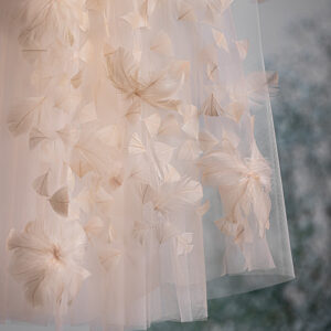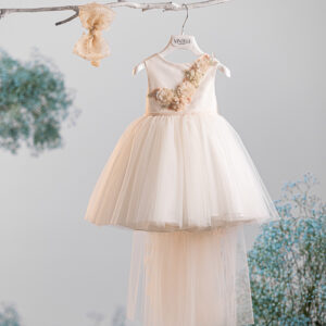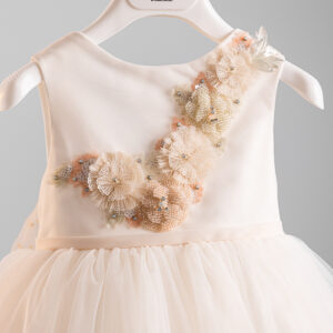 Φόρεμα μεσάτο με χειροποίητο κέντημα στο μπούστο με 3D χάντρες, πέρλες και strass. Η φούστα του φορέματος είναι τούλινη με πουά σομόν φιόγκο στο πίσω μέρος. Ρομαντική διάθεση δίνει η εντυπωσιακή αποσπώμενη ουρά του φορέματος, η οποία διακοσμείται μέχρι το τελείωμα με φτερά σε σομόν απόχρωση. Συνοδεύεται από κλειστή ελαστική κορδέλα για τα μαλλιά με το φιόγκο του φορέματος. Σετ 3 τεμαχίων. * Η τιμή ισχύει για τα μεγέθη έως 24 μηνών.