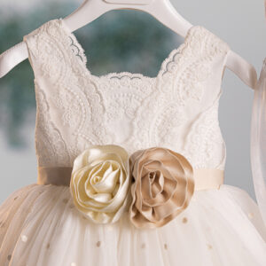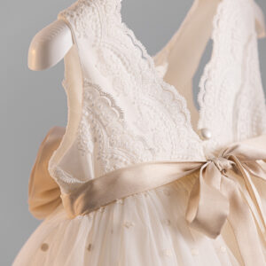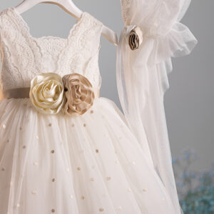 Ρομαντικό μεσάτο φόρεμα με δαντέλα στο κορσάζ και ανάγλυφο βαμβακερό μπεζ πουά στη φούστα. Διακοσμείται με κρεπ σατέν μπεζ ζωνάκι και χειροποίητα λουλούδια εκρού και μπεζ απόχρωση. Η πλάτη του φορέματος σχηματίζει V άνοιγμα με λεπτομέρειες δαντέλας. Το φόρεμα συνοδεύεται από τούλινη πλαϊνή μαντήλα για τα μαλλιά με λεπτομέρειες δαντέλας με το ντεκόρ του φορέματος. Σετ 2 τεμαχίων. Η τιμή ισχύει για τα μεγέθη έως 24 μηνών.