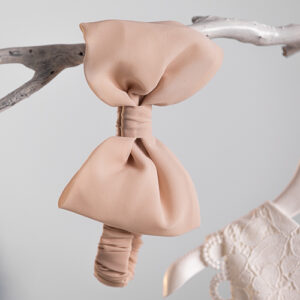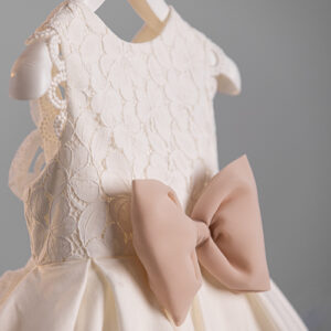 Φόρεμα μεσάτο με δαντέλα στο μπούστο και τρεσάκι σε λεπτομέρειες στους ώμους και στην πλάτη. Παρατηρούμε στην ύφανση της φούστας ένα διακριτικό πουά σε ιβουάρ χρώμα και μεγάλες κουφόπιετες. Το πίσω μέρος στολίζεται με δαντέλα χιαστί που καταλήγει σε δετό φιογκάκι .Το ντεκόρ αποτελείται από ένα μεγάλο ροζ εντυπωσιακό φιόγκο. Συνοδεύεται από κλειστή ελαστική κορδέλα για τα μαλλιά με φιόγκο. Σετ 2 τεμαχίων. Η τιμή ισχύει για τα μεγέθη έως 24 μηνών.