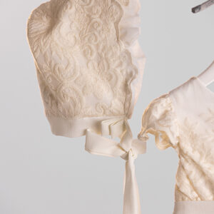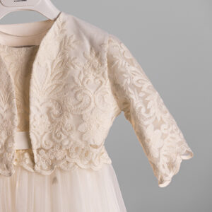 Φόρεμα αγκαλιάς από βαμβακερή ιβουάρ δαντέλα με μπεζ κέντημα και υπέροχα τελειώματα στη φούστα. Στολίζεται με ζωνάκι στο κέντρο. Συνοδεύεται από ζακετάκι και νινίς χειροποίητο καπέλο με ίδια δαντέλα. Σετ 3 τεμαχίων.