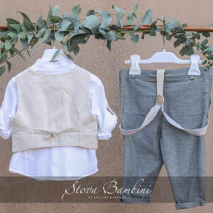 Κοστούμι βάπτισης σε Ιταλικό στυλ με printbespokeύφασμα StovaBambiniστο γιλέκο, και απόχρωση olivemint. Το σετ αποτελείται από 6 τεμάχια,γιλέκο με μπροστινό printκαι πίσω μονόχρωμο της άμμου,βαμβακερό παντελόνι σε olivemint, πουκάμισομάο με φυσική ρίγα στην ύφανση, τιράντες ασορτί, pochette, καπέλο. Συνδυάζεται με ασορτί ανατομικά παπούτσια με το ύφασμα του ρούχου εξωτερικά. Σχεδιάστε τη βάπτιση των ονείρων σας, κάθε ρούχο συνδυάζεται με ανάλογο φιόγκο για το κουτί ή την βαλίτσα σας, λαμπάδα, λαδόπανα, εσώρουχα, πετσέτες και σετ κολυμπήθρας (κεράκια-σαπούνι-μπουκάλι λαδιού), είτε διακοσμημένο και με το θέμα της επιλογής σας.