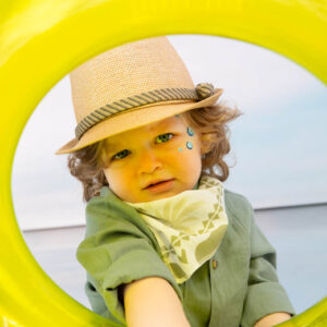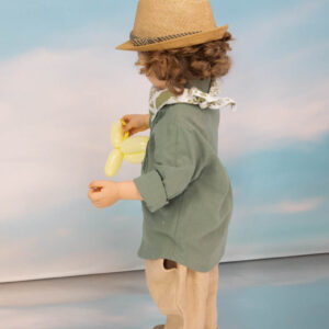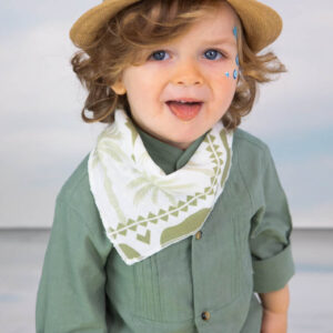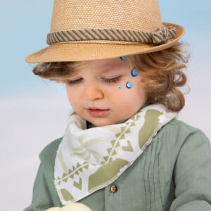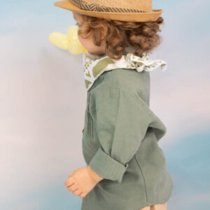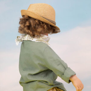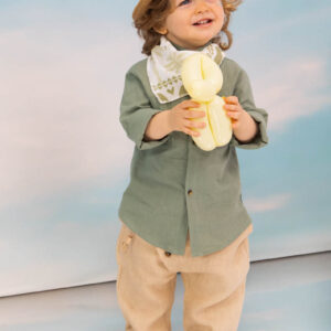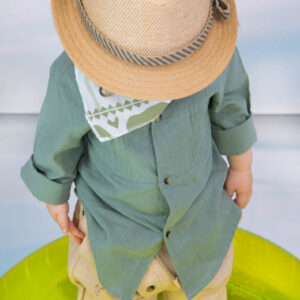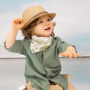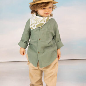 Ο Aggelos είναι ένα σετ βάπτισης σε πολύ ιδιαίτερο χρώμα. Πουκάμισο μάο μέντα με νερβίρ σε λινό 100%. Παντελόνι σε χρώμα μελί σε ύφασμα ψαροκόκκαλο. Φουλάρι με printed σχέδιο με ελέφαντες και φοίνικες. Ζώνη από σκοινί. Καπέλο δίχρωμο μελί με τρέσσα.