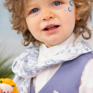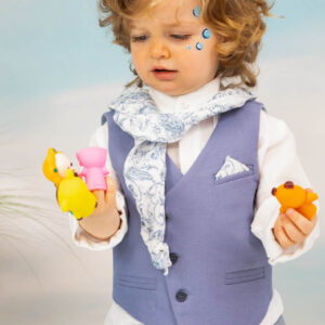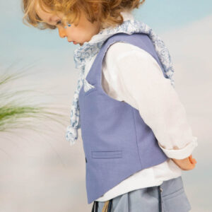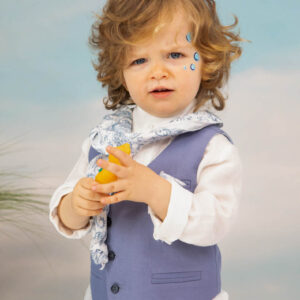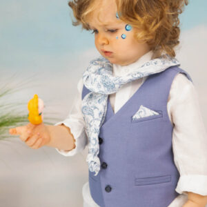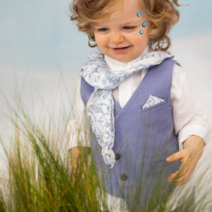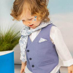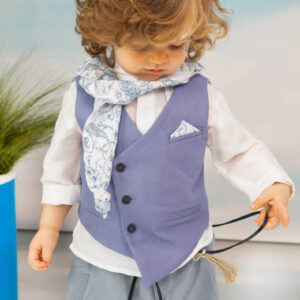 Ο Drosos είναι ένα ξεχωριστό σύνολο βάπτισης σε γκρι και provence blue αποχρώσεις. Γιλέκο diagonal καπαρντίνα Ιταλίας. Πουκαμίσα λευκή λινή 100% εξαιρετικής ποιότητας. Παντελόνι alternative καπαρντίνα Ιταλίας με μπλε δερμάτινη ζώνη και ιδιαίτερο αξεσουάρ. Φουλάρι και μαντήλι από soft touch printed cotton 100%. Καπέλο λευκό καβουράκι με τρέσσα από φουλάρι.