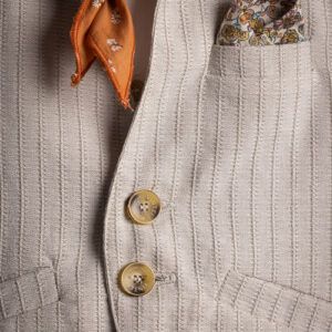 Trois-pièces με μαό γιλέκο σε μπεζ απόχρωση, λευκό πουκάμισο με λαιμόκοψη και κεραμιδί παντελόνι με εξτρά ζωνάκι. Συνοδεύεται από εμπριμέ μαντήλι για το λαιμό σε κεραμιδί απόχρωση, φλοράλ μαντήλι στην τσέπη του γιλέκου, μπεζ τιράντες με κουμπώματα δερματίνης και ψάθινο καβουράκι. Σετ 7 τεμαχίων. Η τιμή ισχύει για τα μεγέθη έως 24 μηνών.