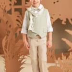 Trois-pièces με μαό γιλέκο σε μπεζ απόχρωση, λευκό πουκάμισο με λαιμόκοψη και κεραμιδί παντελόνι με εξτρά ζωνάκι. Συνοδεύεται από εμπριμέ μαντήλι για το λαιμό σε κεραμιδί απόχρωση, φλοράλ μαντήλι στην τσέπη του γιλέκου, μπεζ τιράντες με κουμπώματα δερματίνης και ψάθινο καβουράκι. Σετ 7 τεμαχίων. Η τιμή ισχύει για τα μεγέθη έως 24 μηνών.