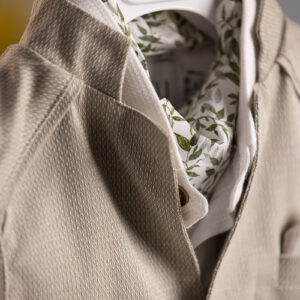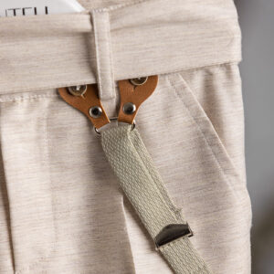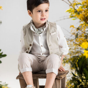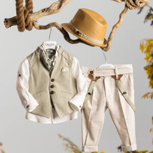 Trois-pièces με ανοιχτό λαδί γιλέκο με μαό γιακά, λευκό βαμβακερό πουκάμισο και μπεζ παντελόνι με τσάκιση και εξτρά ζωνάκι. Συνοδεύεται από εμπριμέ μαντήλι για το λαιμό, τιράντες στο ύφασμα του γιλέκου με κουμπώματα δερματίνης, μπεζ μαντήλι για το πέτο και ψάθινο καβουράκι. Σετ 7 τεμαχίων. Η τιμή ισχύει για τα μεγέθη έως 24 μηνών.
