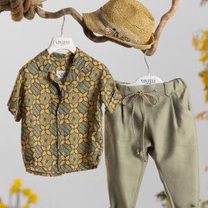 Trois-pièces με μπλε oversize πουκάμισο, ιβουάρ πουκαμίσα και λεμονί παντελόνι. Συνοδεύεται από μπλε μαντήλι με λαχούρια για το λαιμό, γαλάζιες τιράντες με κουμπώματα μπλε δερματίνης και τραγιάσκα. Σετ 6 τεμαχίων. Η τιμή ισχύει για τα μεγέθη έως 24 μηνών.