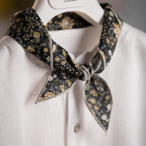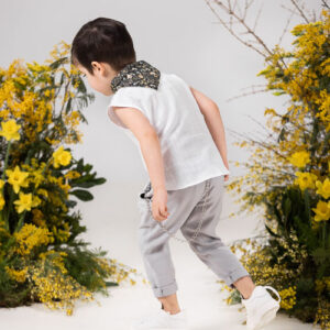 Trois-pièces με μπλε oversize πουκάμισο, ιβουάρ πουκαμίσα και λεμονί παντελόνι. Συνοδεύεται από μπλε μαντήλι με λαχούρια για το λαιμό, γαλάζιες τιράντες με κουμπώματα μπλε δερματίνης και τραγιάσκα. Σετ 6 τεμαχίων. Η τιμή ισχύει για τα μεγέθη έως 24 μηνών.