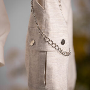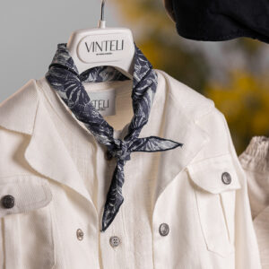 Trois-pièces με εκρού oversize πουκάμισο, εκρού πουκαμίσα και μπεζ cargo παντελόνι με τσέπες. Συνοδεύεται από μπλε εμπριμέ μαντήλι για το λαιμό, αλυσίδα παντελονιού και μπλε τραγιάσκα. Σετ 6 τεμαχίων. Η τιμή ισχύει για τα μεγέθη έως 24 μηνών.