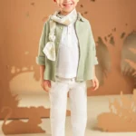 Ένα κομψό μοντέρνο σύνολο βάπτισης που το χαρακτηρίζουν οι μπλε-μπεζ αποχρώσεις, με εξαιρετικής ποιότητας βαμβακερό γιλέκο διακοσμημένο με υπέροχα κουμπιά και μοναδικές λεπτομέρειες. Το σετ αποτελείται από 6 τεμάχια ( γιλέκο, πουκάμισο, παντελόνι, παπιγιόν, ζώνη, καπέλο) και μπορεί να συνδυαστεί άψογα με ασορτί χειροποίητα ανατομικά παπούτσια. Όλα τα υφάσματα των ρούχων είναι από υποαλλεργικό βαμβάκι 100% ή σύμμικτα υποαλλεργικά υφάσματα.