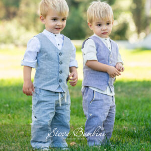 Νέα σειρά Stova Bambini μια πιο ανάλαφρη μοντέρνα πρόταση βάπτισης με υπέροχο γκρι ανοιχτό γιλέκο και λευκό πουκάμισο ¨Mao style”, μοντέρνο παντελόνι ασορτί με το γιλέκο (σορτς ή καπρι capri). Όλα τα υφάσματα των ρούχων Stova Bambini είναι από υποαλλεργικό βαμβάκι 100% ή σύμμικτα υποαλλεργικά υφάσματα. Συνδυάζεται με ασορτί ανατομικά παπούτσια με το ύφασμα του ρούχου εξωτερικά.