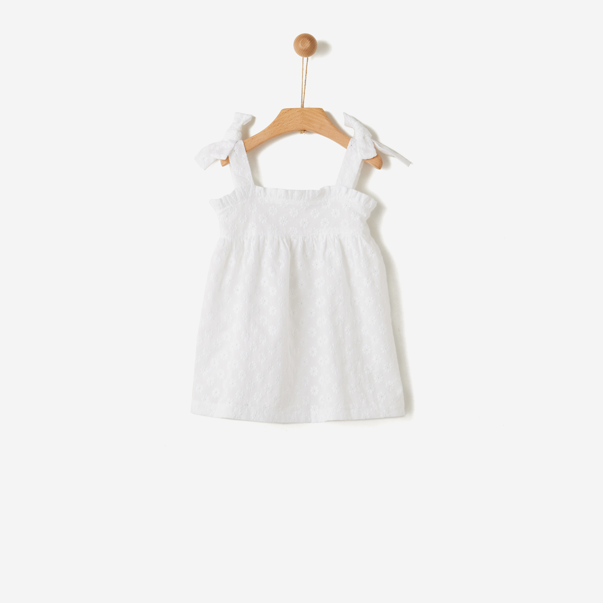 Φόρεμα βαμβακερό σε λευκό χρώμα, με δαντέλα κιπούρ και τιράντες με φιόγκους στους ώμους και κουμπάκια στη πίσω όψη καθώς και από κάτω για εύκολη αλλαγή πάνας. Ιδιαίτερη επιλογή για εντυπωσιακό outfit της μικρής σας.