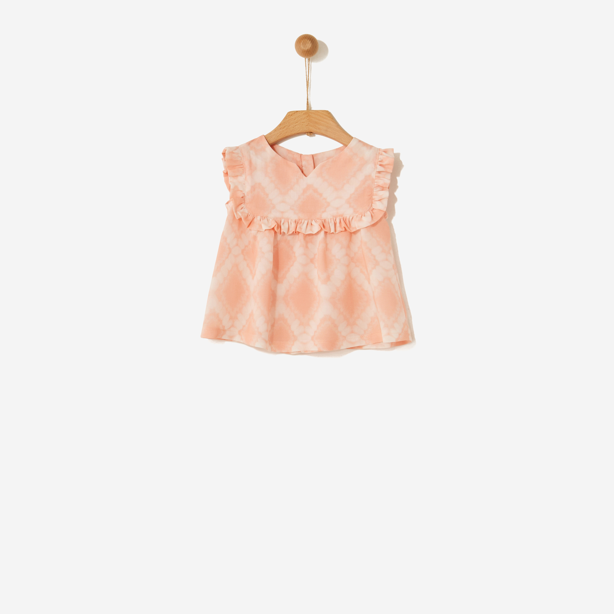 Μπλούζα Tie Die με bib γιακά με βολάν σε χαριτωμένο σομόν χρώμα στο μπούστο και στους ώμους, σε σχέδιο “Τie die”. Συνδυάστε την με τη δική της βερμούδα.