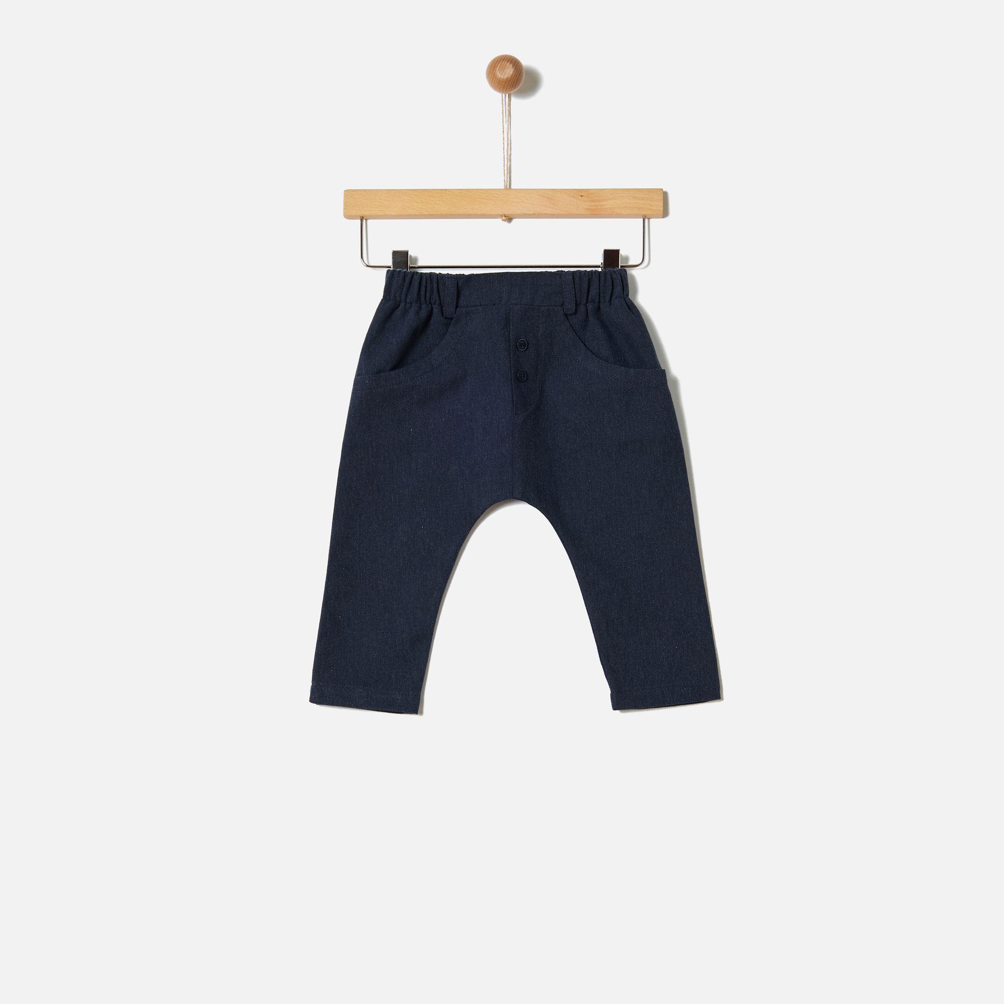 Βαμβακερό παντελόνι για μικρό αγόρι, σε μπλε σκούρο χρώμα, τζιν, με διακοσμητικά κουμπιά, τσέπες στο πλάι και λάστιχο στην μέση. Απλό και σικάτο. Σετάρεται με το αντίστοιχο πουκάμισο