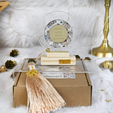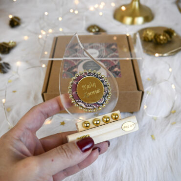 Υλικά: Χειροποίητο δεντράκι από ξύλο οξιάς, φτιαγμένο σε ξυλότορνο, σε καφέ χρώμα, πάνω σε λεπτή ξύλινη βάση φυσικής απόχρωσης. Διακοσμείται περιμετρικά με χρυσή διακοσμητική πολυεστερική τρέσα, εκρού-χρυσό κορδόνι, τεχνητά λουλούδια, πέρλα στην κορυφή του, πολυεστερικές χάντρες υψηλής ποιότητας, διακοσμητική φούντα σε χρυσό χρώμα και εκκρεμές χρυσό μεταλλικό μοτίφ ’2026.