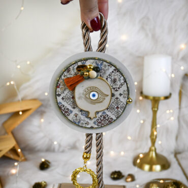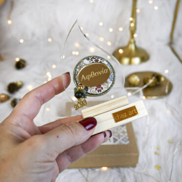 Υλικά: Γούρι ξύλινος πλάστης από ξύλο οξιάς, φτιαγμένο σε ξυλότορνο, σε καφέ χρώμα με χρυσές λεπτομέρειες. Διακοσμείται με χρυσή διακοσμητική τρέσα δερματίνη, διακοσμητική φουντίτσα σε χρυσό χρώμα, διακοσμητικό λουλούδι, πολυεστερικές και ξύλινες χάντρες υψηλής ποιότητας, εκκρεμές χρυσό μεταλλικό μοτίφ ‘2026, ενώ αναγράφεται χειρόγραφα με ειδικό 3D περιγράμματος η φράση “Υγεία, Τύχη, Αφθονία”.